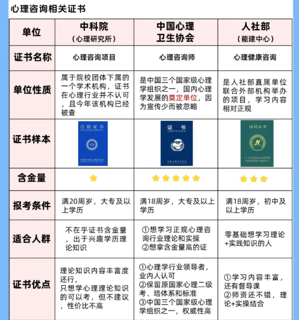 心理咨询师这个职业按小时收费,确实很吸引人报考,不仅能帮别人解决心理问题,而且薪资也很可观。近年来,各种心理咨询师证书也是比较多,小白不知道报考哪种比较好,今天就来给大家介绍这几种证书,帮助大家避开那些坑。